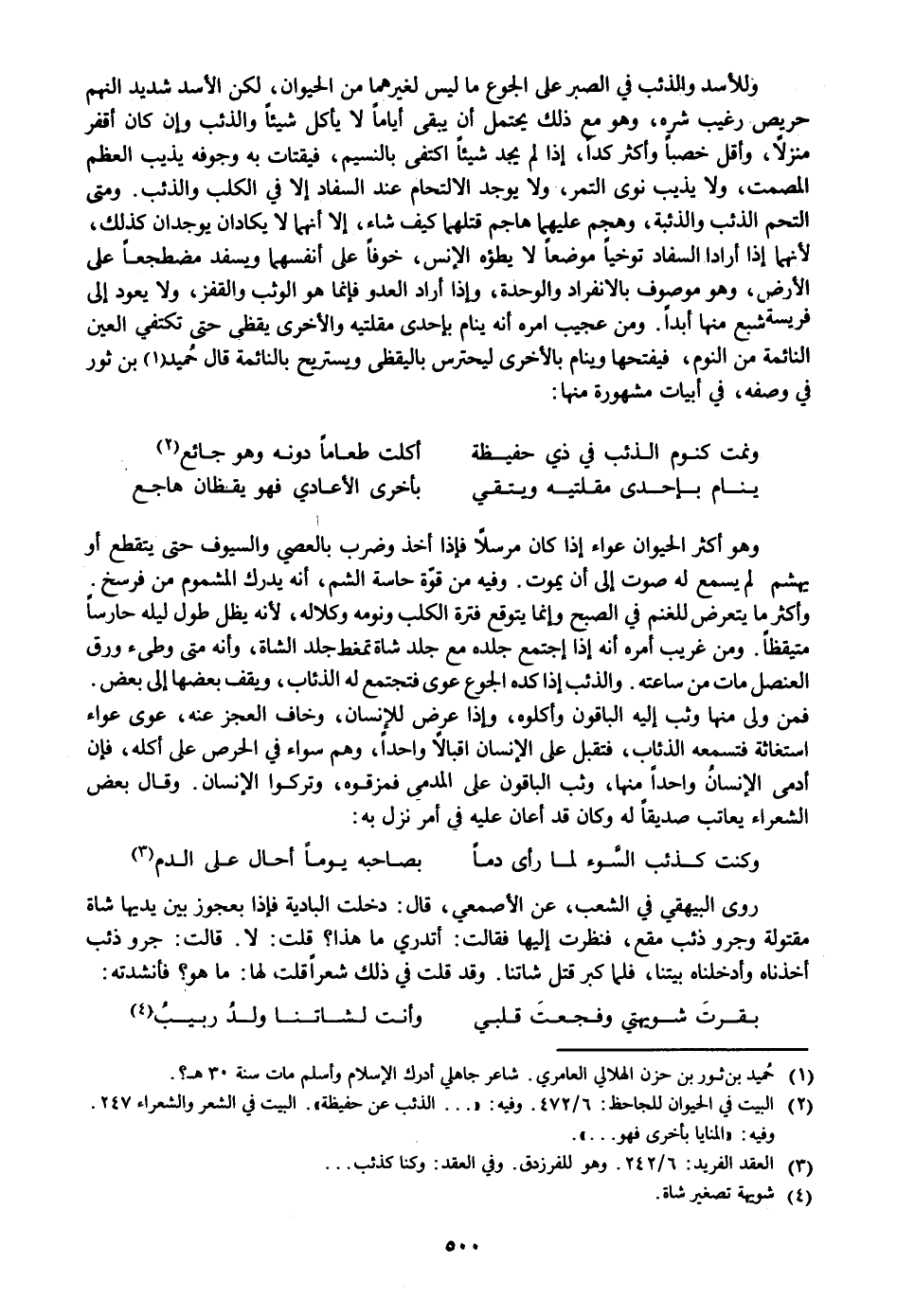 وللأسد والذئب في الصبر على الجوع ما ليس لغيرهما من الحيوان، لكن الأسد شديد النهم حريص رغيب شره، وهو مع ذلك يحتمل أن يبقى أياما لا يأكل شيئا والذئب وإن كان أقفر منزلا، وأقل خصبا وأكثر كدا، إذا لم يجد شيئا اكتفى بالنسيم، فيقتات به وجوفه يذيب العظم المصمت، ولا يذيب نوى التمر، ولا يوجد الالتحام عند السفاد إلا في الكلب والذئب. ومتى التحم الذئب والذئبة، وهجم عليهما هاجم قتلهما كيف شاء، إلا أنهما لا يكادان يوجدان كذلك، لأنهما إذا أرادا السفاد توخيا موضعا لا يطؤه الإنس، خوفا على أنفسهما ويسفد مضطجعا على الأرض، وهو موصوف بالانفراد والوحدة، وإذا أراد العدو فإنما هو الوثب والقفز، ولا يعود إلى فريسة شبع منها أبدا. ومن عجيب امره أنه ينام بإحدى مقلتيه والأخرى يقظى حتى تكتفي العين النائمة من النوم، فيفتحها وينام بالأخرى ليحترس باليقظى ويستريح بالنائمة قال حميد»