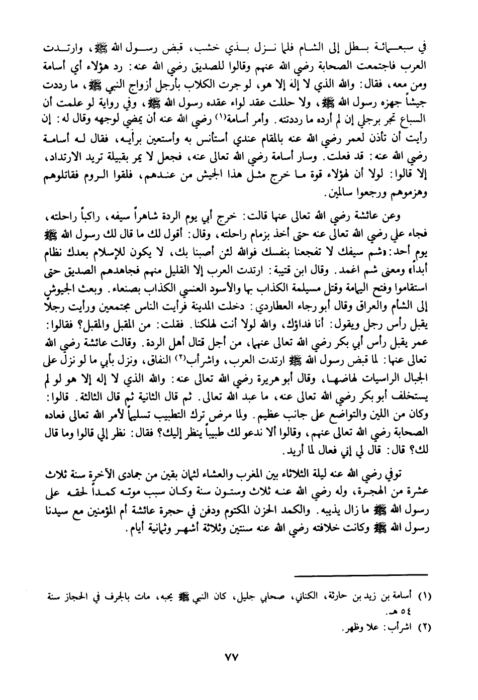 وعن عائشة رضي الله تعالى عنها قالت: خرج أبي يوم الردة شاهرا سيفه، راكبا راحلته، فجاء علي رضي الله تعالى عنه حتى أخذ بزمام راحلته، وقال: أقول لك ما قال لك رسول الله صلى الله عليه وسلم يوم أحد: «شم سيفك لا تفجعنا بنفسك فو الله لئن أصبنا بك، لا يكون للإسلام بعدك نظام أبدا» ومعنى شم اغمد. وقال ابن قتيبة: ارتدت العرب إلا القليل منهم فجاهدهم الصديق حتى استقاموا وفتح اليمامة وقتل مسيلمة الكذاب بها والأسود العنسي الكذاب بصنعاء. وبعث الجيوش إلى الشأم والعراق وقال أبو رجاء العطاردي: دخلت المدينة فرأيت الناس مجتمعين ورأيت رجلا يقبل رأس رجل ويقول: أنا فداؤك، والله لولا أنت لهلكنا. فقلت: من المقبل والمقبل؟ فقالوا: