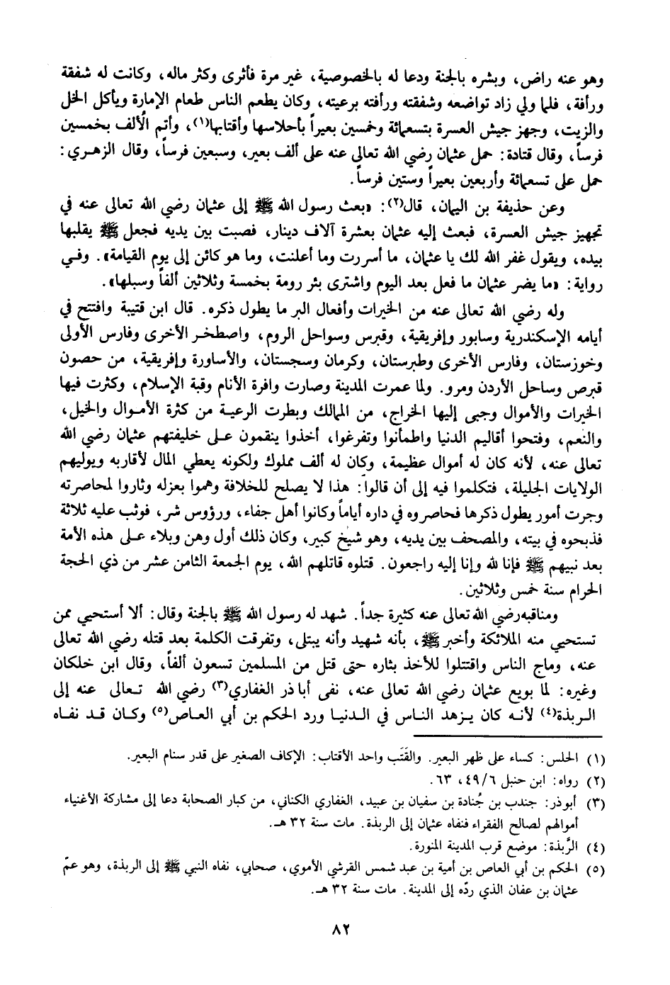 ومناقبه رضي الله تعالى عنه كثيرة جدا. شهد له رسول الله صلى الله عليه وسلم بالجنة وقال: ألا أستحيي ممن تستحيي منه الملائكة وأخبر صلى الله عليه وسلم، بأنه شهيد وأنه يبتلى، وتفرقت الكلمة بعد قتله رضي الله تعالى عنه، وماج الناس واقتتلوا للأخذ بثاره حتى قتل من المسلمين تسعون ألفا، وقال ابن خلكان وغيره: لما بويع عثمان رضي الله تعالى عنه، نفى أباذر الغفاري «3» رضي الله تعالى عنه إلى الربذة «4» لأنه كان يزهد الناس في الدنيا ورد الحكم بن أبي العاص «5» وكان قد نفاه