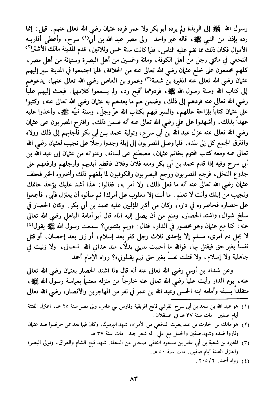 رسول الله صلى الله عليه وسلم إلى الربذة ولم يرده أبو بكر ولا عمر فرده عثمان رضي الله تعالى عنهم. قيل: إنما رده بإذن من النبي صلى الله عليه وسلم، قاله غير واحد. ولى مصر عبد الله بن أبي «1» سرح، وأعطى أقاربه الأموال فكان ذلك مما نقم عليه الناس، فلما كانت سنة خمس وثلاثين، قدم المدينة مالك الأشتر «2» النخعي في مائتي رجل من أهل الكوفة، ومائة وخمسين من أهل البصرة وستمائة من أهل مصر، كلهم مجمعون على خلع عثمان رضي الله تعالى عنه من الخلافة، فلما اجتمعوا في المدينة سير إليهم عثمان رضي الله تعالى عنه المغيرة بن شعبة «3» وعمرو بن العاص رضي الله تعالى عنهما، يدعوهم إلى كتاب الله وسنة رسول الله صلى الله عليه وسلم، فردوهما أقبح رد، ولم يسمعوا كلامهما. فبعث إليهم عليا رضي الله تعالى عنه فردهم إلى ذلك، وضمن لهم ما يعدهم به عثمان رضي الله تعالى عنه، وكتبوا على عثمان كتابا بإزاحة عللهم، والسير فيهم بكتاب الله عزّ وجلّ، وسنة نبيّه صلى الله عليه وسلم، وأخذوا عليه عهدا بذلك، وأشهدوا على علي رضي الله تعالى عنه أنه ضمن ذلك، واقترح المصريون على عثمان رضي الله تعالى عنه عزل عبد الله بن أبي سرح، وتولية محمد بن أبي بكر فأجابهم إلى ذلك وولاه وافترق الجمع كل إلى بلده، فلما وصل المصريون إلى إيلة وجدوا رجلا على نجيب لعثمان رضي الله تعالى عنه ومعه كتاب مختوم بخاتم عثمان، مصطنع على لسانه، وعنوانه من عثمان إلى عبد الله بن أبي سرح وفيه إذا قدم محمد بن أبي بكر ومعه فلان وفلان فاقطع أيديهم وأرجلهم وارفعهم على جذوع النخل، فرجع المصريون ورجع البصريون والكوفيون لما بلغهم ذلك وأخبروه الخبر فحلف عثمان رضي الله تعالى عنه أنه ما فعل ذلك، ولا أمر به، فقالوا: هذا أشد عليك يؤخذ خاتمك ونجيب من إبلك وأنت لا تعلم. ما أنت إلا مغلوب على أمرك! ثم سألوه أن يعتزل فأبى، فأجمعوا على حصاره فحاصروه في داره، وكان من أكبر المؤلبين عليه محمد بن أبي بكر. وكان الحصار في سلخ شوال، واشتد الحصار، ومنع من أن يصل إليه الماء قال أبو أمامة الباهلي رضي الله تعالى عنه: كنا مع عثمان وهو محصور في الدار، فقال: «وبم يقتلوني؟ سمعت رسول الله صلى الله عليه وسلم يقول «4» لا يحل دم امرىء مسلم إلا بإحدى ثلاث رجل كفر بعد إسلام، أو زنى بعد إحصان، أو قتل نفسا بغير حق فيقتل بها، فو الله ما أحببت بديني بدلا، منذ هداني الله تعالى، ولا زنيت في جاهلية ولا إسلام، ولا قتلت نفسا بغير حق فبم يقتلوني» ؟ رواه الإمام أحمد.