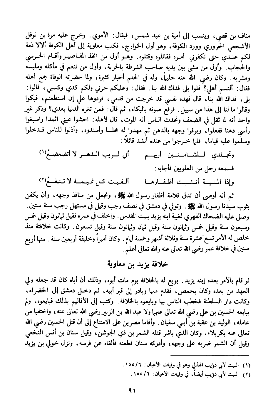 ثو قام بالأمر بعده إبنه يزيد. بويع له بالخلافة يوم مات أبوه، وذلك أن أباه كان قد جعله ولي العهد من بعده وكان بحمص، فقدم منها وبادر إلى قبر أبيه، ثم دخل دمشق إلى الخضراء، وكانت دار السلطنة فخطب الناس بها وبايعوه بالخلافة. وكتب إلى الأقاليم بذلك فبايعوه، ولم يبايعه الحسين بن علي رضي الله تعالى عنهما ولا عبد الله بن الزبير رضي الله تعالى عنه، واختفيا من عامله، الوليد بن عقبة بن أبي سفيان. وأقاما مصرين على الامتناع إلى أن قتل الحسين رضي الله تعالى عنه بكربلاء، وكان الذي باشر قتله الشمر بن ذي الجوشن، وقيل سنان بن أنس النخعي وقيل أن الشمر ضربه على وجهه، وأدركه سنان فطعنه فألقاه عن فرسه، ونزل خولي بن يزيد