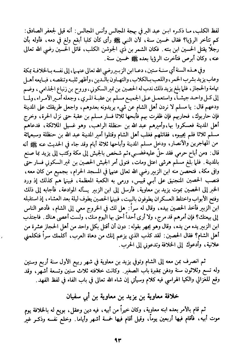 وفي هذه السنة أي سنة ستين، دعا ابن الزبير رضي الله تعالى عنهما، إلى نفسه بالخلافة بمكة وعاب يزيد بشرب الخمر، واللعب بالكلاب، والتهاون بالدين، وأظهر ثلبه وتنقصه، فبايعه أهل تهامة والحجاز، فلما بلغ يزيد ذلك ندب له الحصين بن نمير السكوني، وروح بن زنباع الجذامي، وضم إلى كل واحد جيشا، واستعمل على الجميع مسلم بن عقبة المري، وجعله أمير الأمراء، ولما ودعهم قال: يا مسلم لا نردن أهل الشام عن شيء يريدونه بعدوهم، واجعل طريقك على المدينة فإن حاربوك، فحاربهم فإن ظفرت بهم فأبحها ثلاثا فسار مسلم بن عقبة حتى نزل الحرة، وخرج أهل المدينة فعسكروا بها، وأميرهم عبد الله بن حنظلة الراهب، وهو غسيل الملائكة، فدعاهم مسلم ثلاثا فلم يجيبوه، فقاتلهم فغلب أهل الشام وقتلوا أمير المدينة عبد الله بن حنظلة وسبعمائة من المهاجرين والأنصار، ودخل مسلم المدينة وأباحها ثلاثة أيام وقد جاء في الحديث عنه صلى الله عليه وسلم أنه قال: «من أباح حرمي فقد حلّ عليه غضبي» ثم شخص بالجيش إلى مكة وكتب إلى يزيد بما صنع بالمدينة. فلما بلغ مسلم هرشى اعتل ومات، فتولى أمر الجيش الحصين بن نمير السكوني فسار حتى وافى مكة، فتحصن منه ابن الزبير رضي الله تعالى عنهما في المسجد الحرام، بجميع من كان معه، فنصب الحصين المنجنيق على أبي قبيس، ورمى به الكعبة المعظمة، فبينما هم كذلك إذ ورد الخبر إلى الحصين بموت يزيد بن معاوية، فأرسل إلى ابن الزبير يسأله الموادعة، فأجابه إلى ذلك وفتح الأبواب واختلط العسكران يطوفون بالبيت، فبينما الحصين يطوف ليلة بعد العشاء، إذ استقبله ابن الزبير فأخذ الحصين بيده، وقال له سرا: هل لك في الخروج معي إلى الشام، فأدعو الناس إلى بيعتك؟ فإن أمرهم قد مرج، ولا أرى أحدا أحق بها اليوم منك، ولست أعصى هناك. فاجتذب ابن الزبير يده من يده، وقال وهو يجهر بقوله: دون أن أقتل بكل واحد من أهل الحجاز عشرة من أهل الشام؟ فقال الحصين: لقد كذب الذي يزعم إنك من دهاة العرب، أكلمك سرا فتكلمني علانية، وأدعوك إلى الخلافة وتدعوني إلى الحرب.