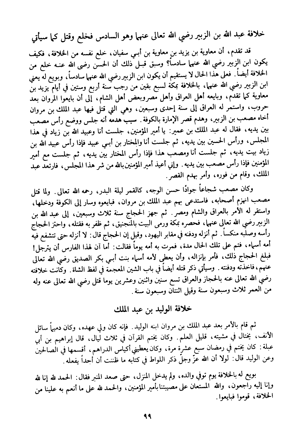 قد تقدم، أن معاوية بن يزيد بن معاوية بن أبي سفيان، خلع نفسه من الخلافة، فكيف يكون ابن الزبير رضي الله عنهما سادسا؟ وسبق قبل ذلك أن الحسن رضى الله عنه خلع من الخلافة أيضا. فعلى هذا الحال لا يستقيم أن يكون ابن الزبير رضي الله عنهما سادسا، وبويع له يعني ابن الزبير رضي الله عنهما، بالخلافة بمكة لسبع بقين من رجب سنة أربع وستين في أيام يزيد بن معاوية كما تقدم، وبايعه أهل العراق وأهل مصر وبعض أهل الشام، إلى أن بايعوا المروان بعد حروب، واستمر له العراق إلى سنة إحدى وسبعين، وهي التي قتل فيها عبد الملك بن مروان أخاه مصعب بن الزبير، وهدم قصر الإمارة بالكوفة. سبب هدمه أنه جلس ووضع رأس مصعب بين يديه، فقال له عبد الملك بن عمير: يا أمير المؤمنين، جلست أنا وعبيد الله بن زياد في هذا المجلس، ورأس الحسين بين يديه، ثم جلست أنا والمختار بن أبي عبيد فإذا رأس عبيد الله بن زياد بيت يديه، ثم جلست أنا ومصعب هذا فإذا رأس المختار بين يديه، ثم جلست مع أمير المؤمنين فإذا رأس مصعب بين يديه. وإني أعيذ أمير المؤمنين بالله من شر هذا المجلس، فارتعد عبد الملك، وقام من فوره، وأمر بهدم القصر.