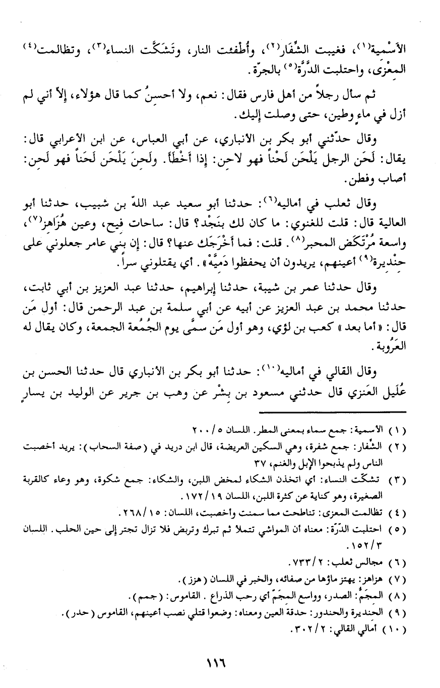 وقال القالي في أماليه: حدثنا أبو بكر بن الأنباري قال حدثنا الحسن بن عُلَيل العَنزي قال حدثني مسعود بن بِشْر عن وهب بن جرير عن الوليد بن يسارٍ