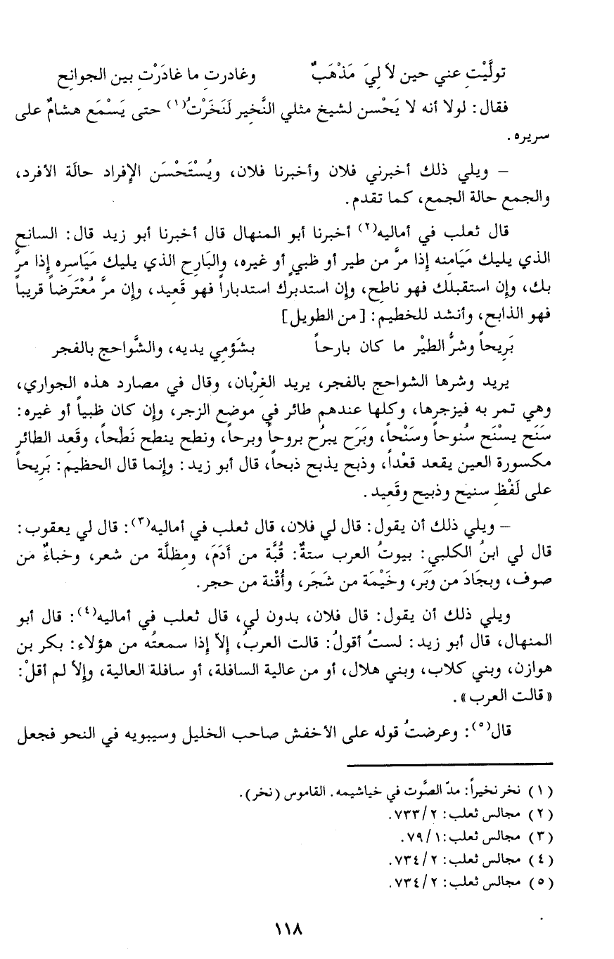 ويلي ذلك أن يقول: قال فلان بدون لي قال ثعلب في أماليه: قال أبو المنهال قال أبو زيد: لستُ أقولُ: قالت العربُ إلا إذا سمعتُه من هؤلاء: بكر بن هوازن وبني كلاب وبني هلال أو من عالية السافلة أو سافلة العالية وإلا لم أقلْ: (قالت العرب) .