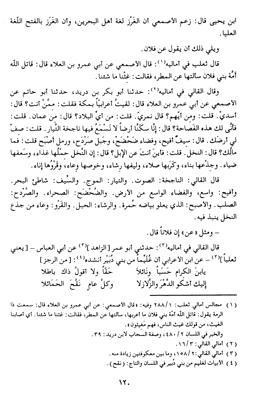 وقال القالي في أماليه: حدثنا أبو بكر بن دريد حدثنا أبو حاتم عن الأصمعي عن أبي عمرو بن العلاء قال: لقيتُ أعرابيا بمكة فقلت: مِمَّنْ أنت قال: أسدي.