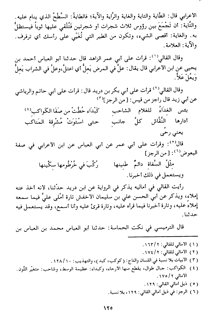 رأيت القالي في أماليه يذكر في الرواية عن ابن دريد حدثنا لأنه أخذ عنه إملاء ويذكر عن أبي الحسن علي بن سليمان الأخفش تارة أمْلى عليَّ فيما سمعه إملاء عليه وتارة أخبرنا فيما قرأه عليه وتارة قرىء عليه وأنا أسمع وقد يستعمل فيه حدثنا.