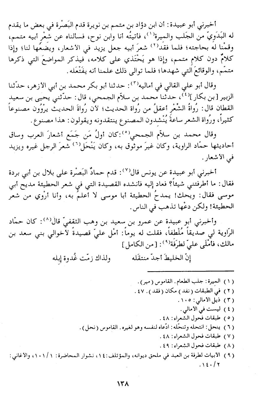وأخبرني أبو عبيدة عن عمرو بن سعيد بن وهب الثقفي قال: كان حماد الراوية لي صديقا مُلْطِفاً فقلت له يوما: أمْل علي قصيدة لأخوالي بني سعد بن مالك فأمْلَى علي لطرفة: // من الكامل //