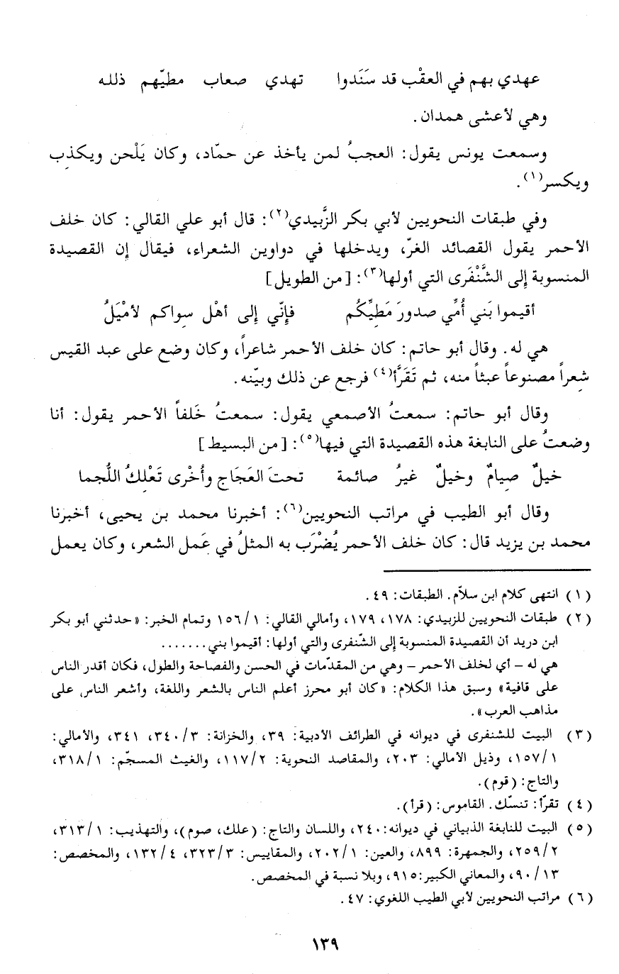 وفي طبقات النحويين لأبي بكر الزَّبيدي: قال أبو علي القالي: كان خلف الأحمر يقول القصائد الغر ويدخلها في دواوين الشعراء فيقال إن القصيدة المنسوبة إلى الشنفرى التي أولها: // من الطويل //