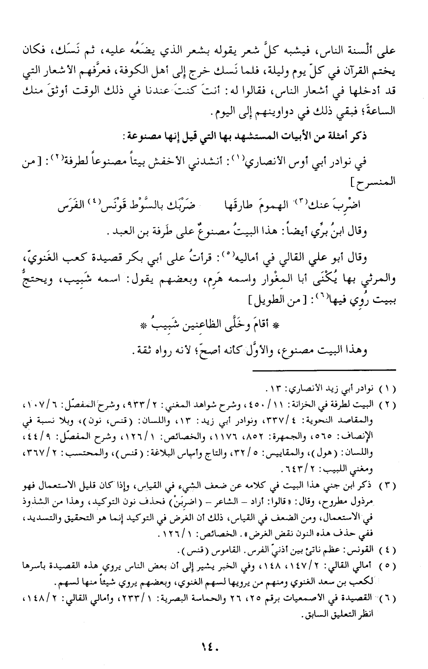 في نوادر أبي أوس الأنصاري: أنشدني الأخفش بيتا مصنوعا لطرفة: // من المنسرح //