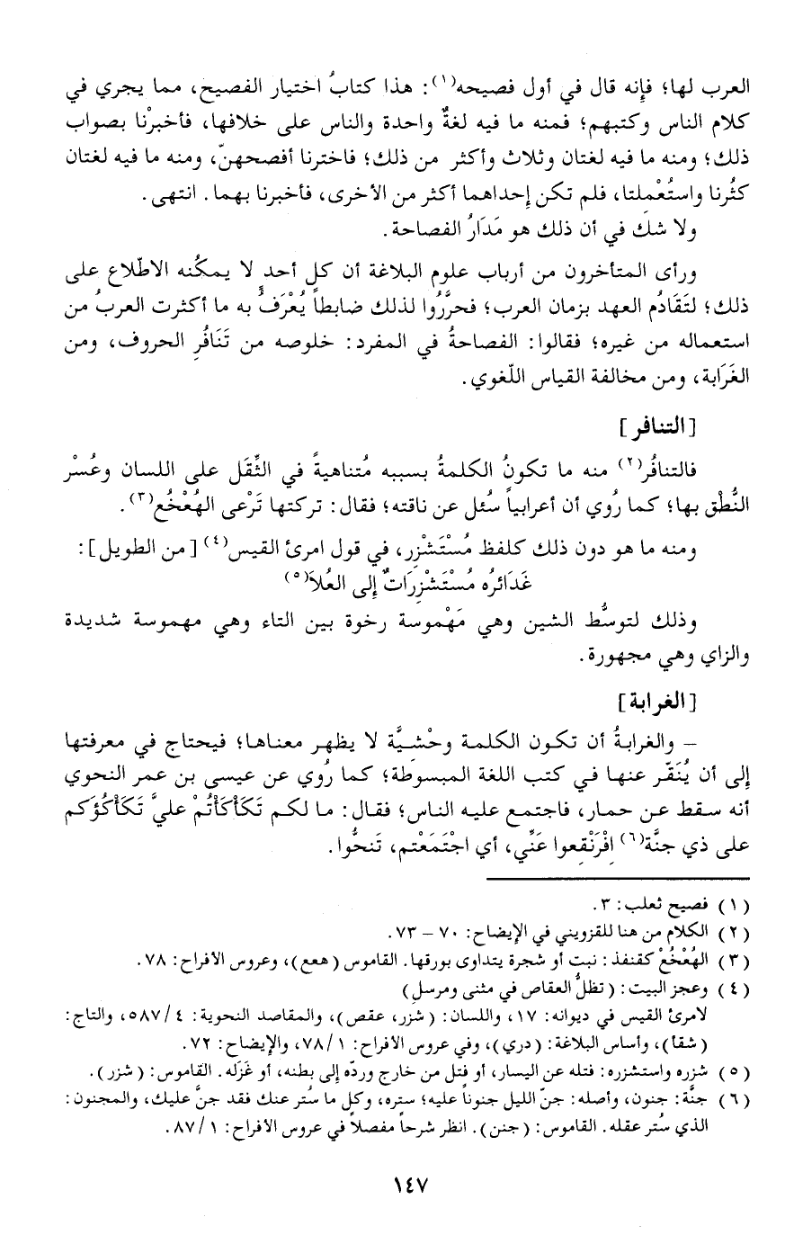 - والغرابةُ أن تكون الكلمة وحْشِيَّة لا يظهر معناها فيحتاج في معرفتها إلى أن يُنَقّر عنها في كتب اللغة المبسوطة كما رُوي عن عيسى بن عمر النحوي أنه سقط عن حمار فاجتمع عليه الناس فقال: ما لكم تكأكأتم علي تكأكؤكم على ذي جنَّة اِفْرَنْقِعوا عَنِّي أي اجْتَمَعْتم تنحوا.