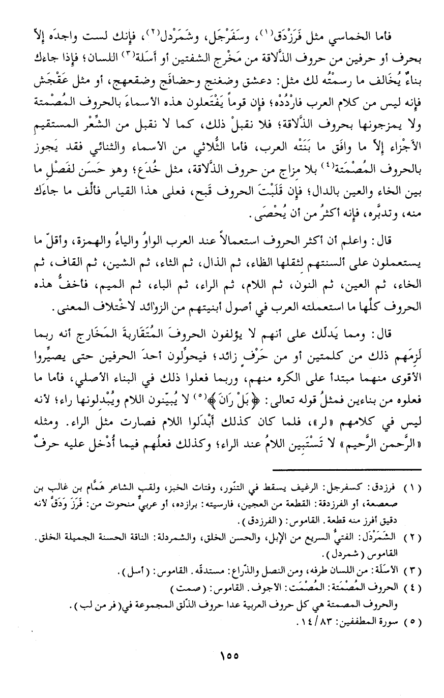 فأما الخماسي مثل فَرَزْدَق وسَفَرْجَل وشَمَرْدل فإنك لست واجدَه إلا بحرف أو حرفين من حروف الذَّلاقة من مَخْرج الشفتين أو أَسَلة اللسان فإذا جاءك بناءٌ يُخَالف ما رسمْتُه لك مثل: دعشق وضغنج وحضافَج وضقعهج أو مثل عقجش فإنه ليس من كلام العرب فارْدُدْه فإن قوما يَفْتَعلون هذه الأسماءَ بالحروف المُصْمتة ولا يمزجونها بحروف الذَّلاقة فلا نقبلْ ذلك كما لا نقبل من الشِّعْر المستقيمِ الأَجْزاء إلا ما وافق ما بنته العرب فأما الثُّلاثي من الأسماء والثنائي فقد يَجوز بالحروف المُصْمَتة بلا مِزاج من حروف الذَّلاقة مثل خُدَع وهو حَسَن لفَصْلِ ما بين الخاء والعين بالدال فإن قَلَبْتَ الحروف قَبح فعلى هذا القياس فألِّف ما جاءَك منه وتدبَّره فإنه أكثرُ من أن يُحْصَى.