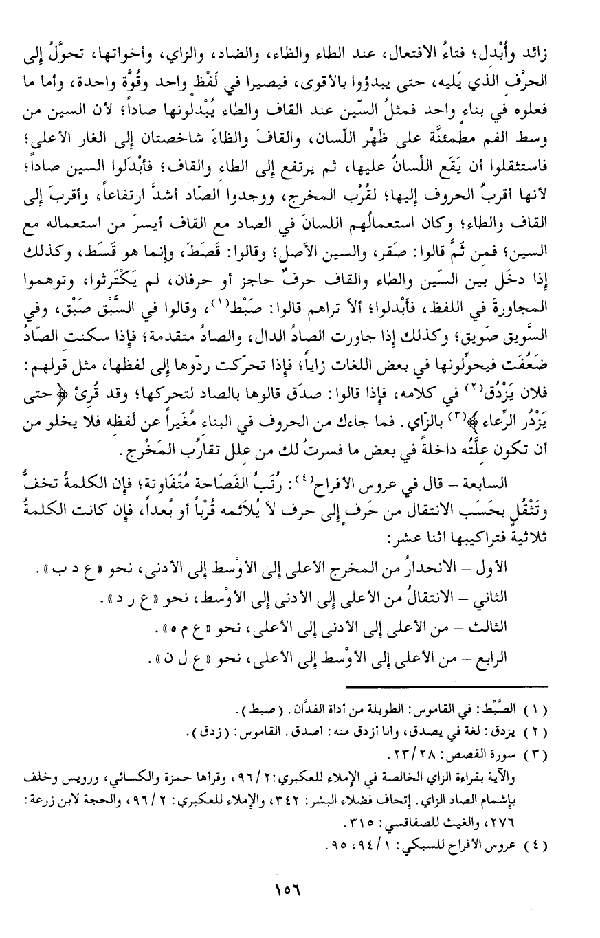 زائد وأُبْدِل فتاءُ الافتعال عند الطاء والظاء والضاد والزاي وأخواتها تحوَّلُ إلى الحرْفِ الذي يَليه حتى يبدؤوا بالأقوى فيصيرا في لَفْظٍ واحد وقُوَّة واحدة وأما ما فعلوه في بناءٍ واحد فمثلُ السين عند القاف والطاء يُبْدلونها صادا لأن السين من وسط الفم مطمئنَّة على ظَهْر اللسان والقافَ والظاءَ شاخصتان إلى الغار الأعلى فاستثقلوا أن يَقَع اللِّسانُ عليها ثم يرتفع إلى الطاءِ والقاف فأبْدَلوا السين صادا لأنها أقربُ الحروف إليها لقُرْب المخرج ووجدوا الصاد أشدَّ ارتفاعا وأقربَ إلى القاف والطاء وكان استعمالُهم اللسانَ في الصاد مع القاف أيسرَ من استعماله مع السين فمِن ثَمَّ قالوا: صَقر والسين الأَصل وقالوا: قَصَطَ وإنما هو قَسَط وكذلك إذا دخَل بين السين والطاء والقاف حرفٌ حاجز أو حرفان لم يَكْتَرثوا وتوهموا المجاورةَ في اللفظ فأَبْدلوا ألاَ تراهم قالوا: صَبْط وقالوا في السَّبْق صَبْق وفي السَّويق صَويق وكذلك إذا جاورت الصادُ الدال والصادُ متقدمة فإذا سكنتِ الصّادُ ضَعُفَت فيحوِّلونها في بعض اللغات زايا فإذا تحركت ردوها إلى لفظها مثل قولهم: فلان يَزْدُق في كلامه فإذا قالوا صدَق قالوها بالصاد لتحركها وقد قرىء حتى يَزْدُر الرِّعاء بالزاي.