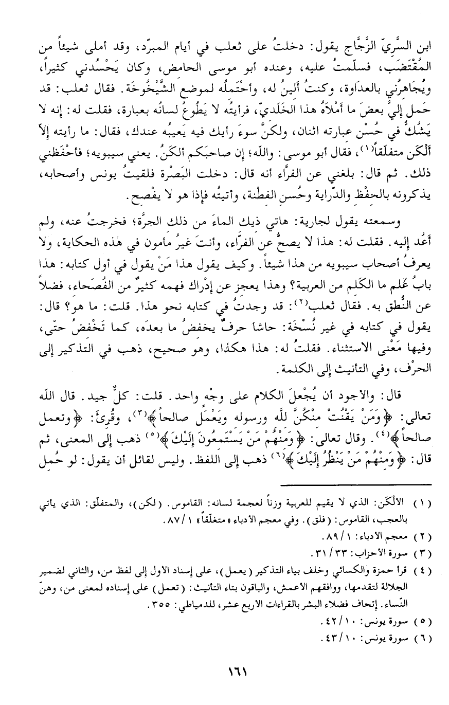 ثم قال: بلغني عن الفرَّاء أنه قال: دخلت البَصْرة فلقيتُ يونس وأصحابه يذكرونه بالحِفْظِ والدراية وحُسنِ الفِطْنة وأتيتُه فإذا هو لا يفصح. وسمعته يقول كجارته: هاتي ذِيكِ الماءَ من ذلكِ الجرَّة فخرجتُ عنه ولم أَعُد إليه. فقلت له: هذا لا يصحُّ عن الفراء وأنتَ غيرُ مأمون في هذه الحكاية ولا يعرفُ أصحاب سيبويه من هذا شيئا. وكيف يقول هذا مَنْ يقول في أول كتابه: هذا بابُ علم ما الكَلِم من العربية وهذا يعجِز عن إدراك فهمه كثيرة من الفُصَحاءِ فضلا عن النُّطق به.