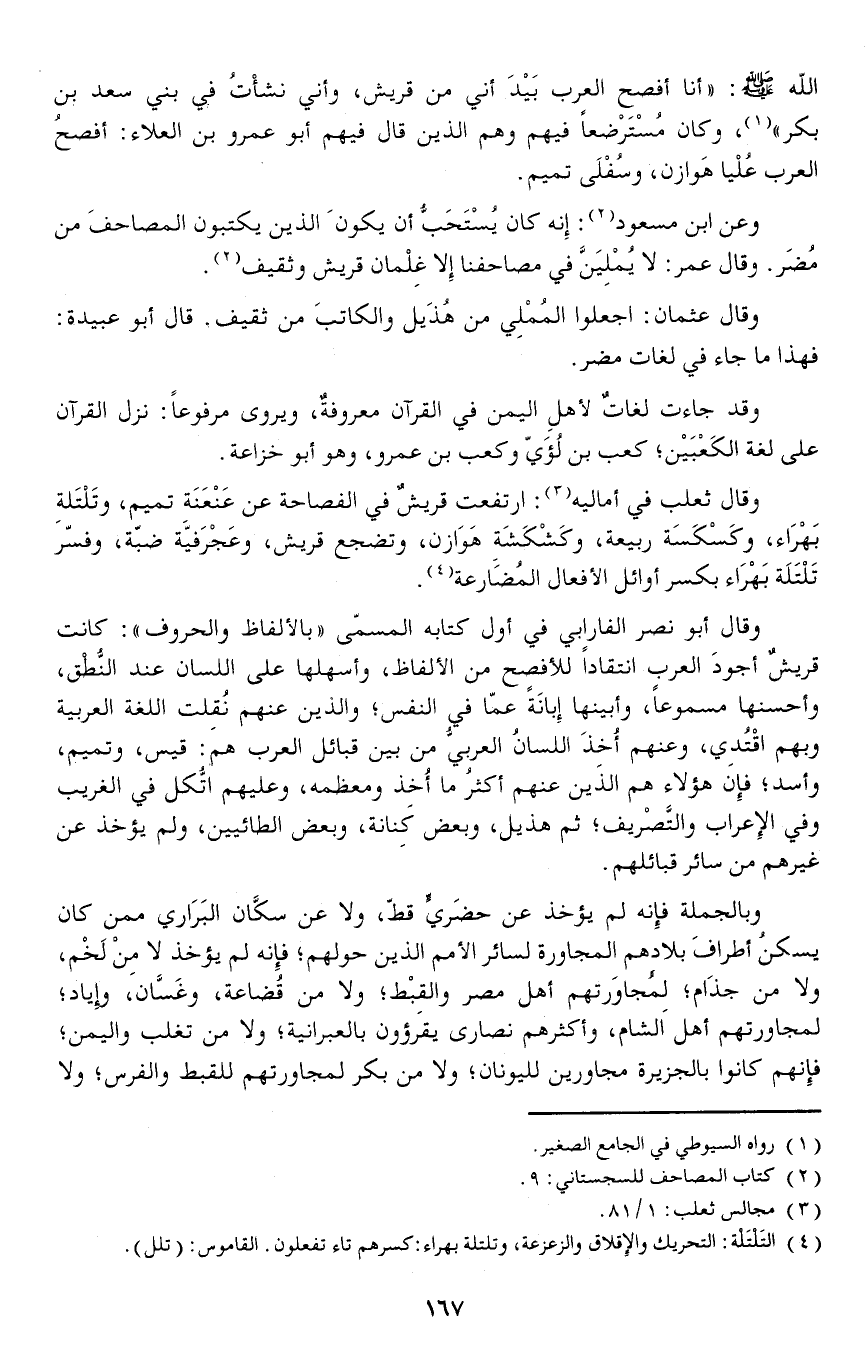 وقال أبو نصر الفارابي في أول كتابه المسمى (بالألفاظ والحروف) : كانت قريشٌ أجودَ العرب انتقادا للأفصح من الألفاظ وأسهلها على اللسان عند النُّطْق وأحسنها مسموعا وأبينها إبانَة عما في النفس والذين عنهم نُقِلت اللغة العربية وبهم اقْتُدِي وعنهم أُخِذَ اللسانُ العربيٌّ من بين قبائل العرب هم: قيس وتميم وأسد فإن هؤلاء هم الذين عنهم أكثرُ ما أُخِذ ومعظمه وعليهم اتُّكل في الغريب وفي الإعراب والتَّصْريف ثم هذيل وبعض كِنانة وبعض الطائيين ولم يؤخذ عن غيرهم من سائر قبائلهم.