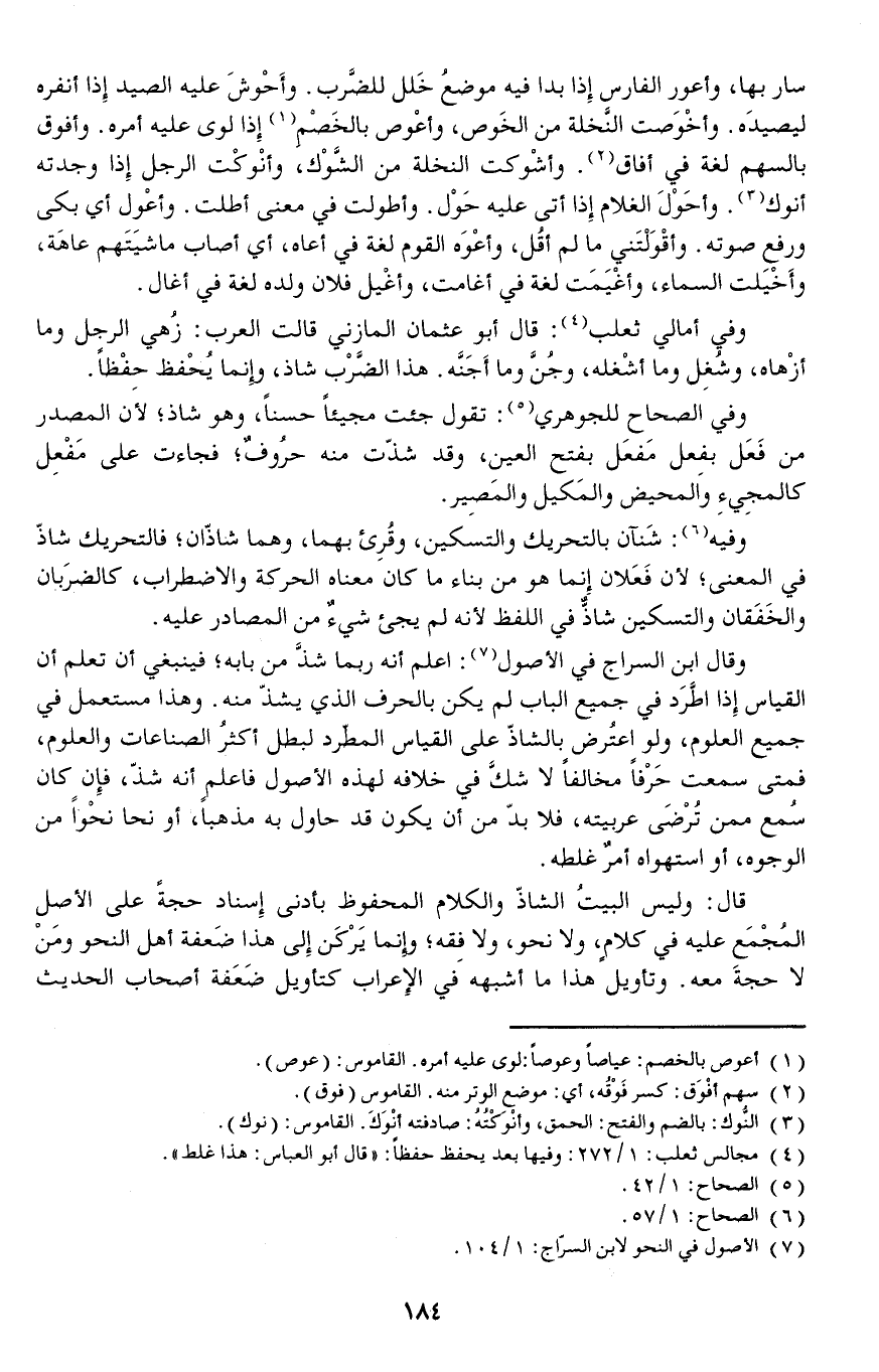 وهذا مستعمل في جميع العلوم ولو اعتُرض بالشاذ على القياس المطرد لبطل أكثرُ الصناعات والعلوم فمتى سمعت حَرْفاً مخالفا لا شكَّ في خلافه لهذه الأصول فاعلم أنه شذ فإن كان سُمع ممن تُرْضَى عربيته فلا بد من أن يكون قد حاول به مذهبا أو نحا نحْواً من الوجوه أو استهواه أمرٌ غلطه.