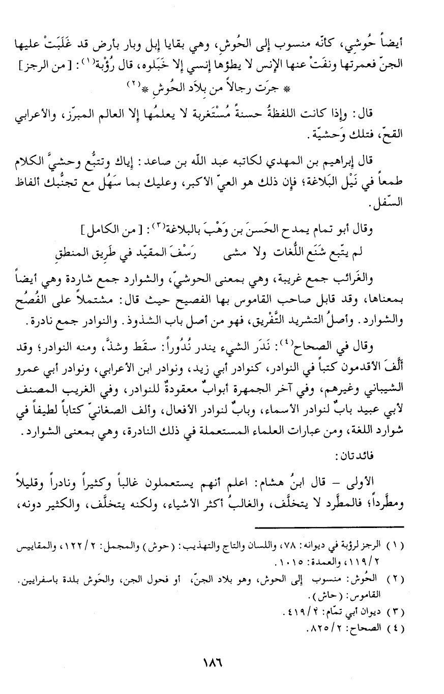 وقال في الصحاح: نَدَر الشيء يندر نُدُوراً سقَط وشذَّ ومنه النوادر وقد أَلَّفَ الأقدمون كتبا في النوادر كنوادر أبي زيد ونوادر ابن الأعرابي ونوادر أبي عمرو الشيباني وغيرهم وفي آخر الجمهرة أبوابٌ معقودةٌ للنوادر وفي الغريب المصنف لأبي عبيد بابٌ لنوادر الأسماء وبابٌ لنوادر الأفعال وألف الصغاني كتابا لطيفا في شوارد اللغة ومن عبارات العلماء المستعملة في ذلك النادرة وهي بمعنى الشوارد.