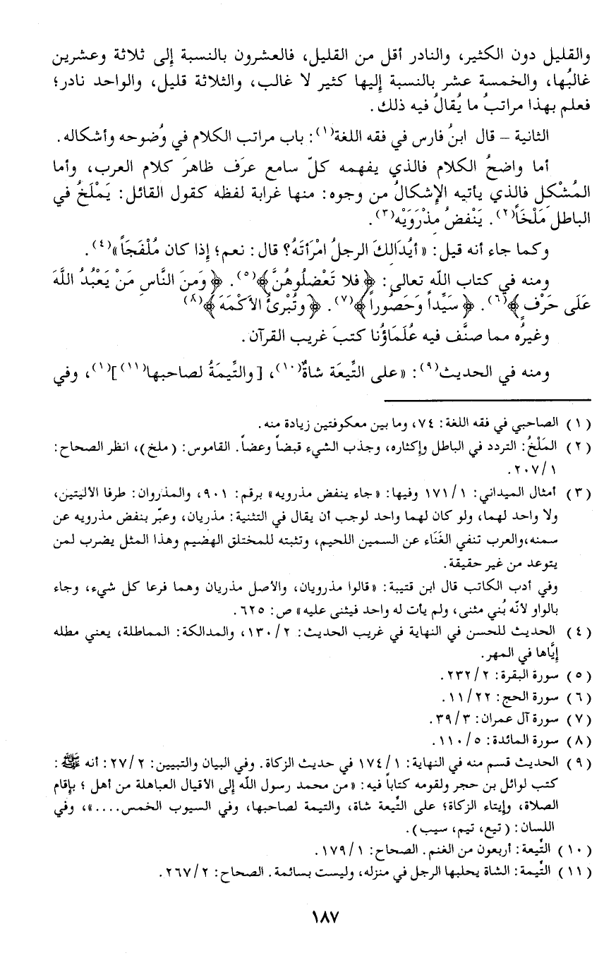 الثانية - قال ابنُ فارس في فقه اللغة: باب مراتب الكلام في وُضوحه وأشكاله.