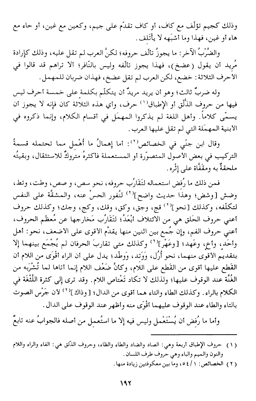 فمن ذلك ما رُفِض استعماله لتَقَارُب حروفه نحو سص وصص وطت وتط وضش (وشض وهذا حديث واضح) لنُفور الحسِّ عنه والمشقَّة على النفس لتكلفه وكذلك (نحو) قج وجق وكق وقك وكج وجك وكذلك حروف أعني حروف الحَلق هي من الائتلاف أبْعَدُ لتَقَارُب مَخارجها عن مُعظَم الحروف أعني حروف الفم وإن جُمع بين اثنين منها يقدَّم الأقوى على الأضعف نحو: أهل وأحَدٍ وأخٍ وعَهد (وعَهْر) وكذلك متى تقاربَ الحرفان لم يُجْمَع بينهما إلا بتقديم الأقوى منهما نحو أُرُل وَوَتِد وَوطْد يدل على أن الراء أقْوَى من اللام أن القَطع عليها أقوى من القَطع على اللام وكأنَّ ضَعْف اللام إنما أتاها لما تُشْرَبه من الغُنَّة عند الوقوف عليها ولذلك لا تكاد تَعْتاص اللام.