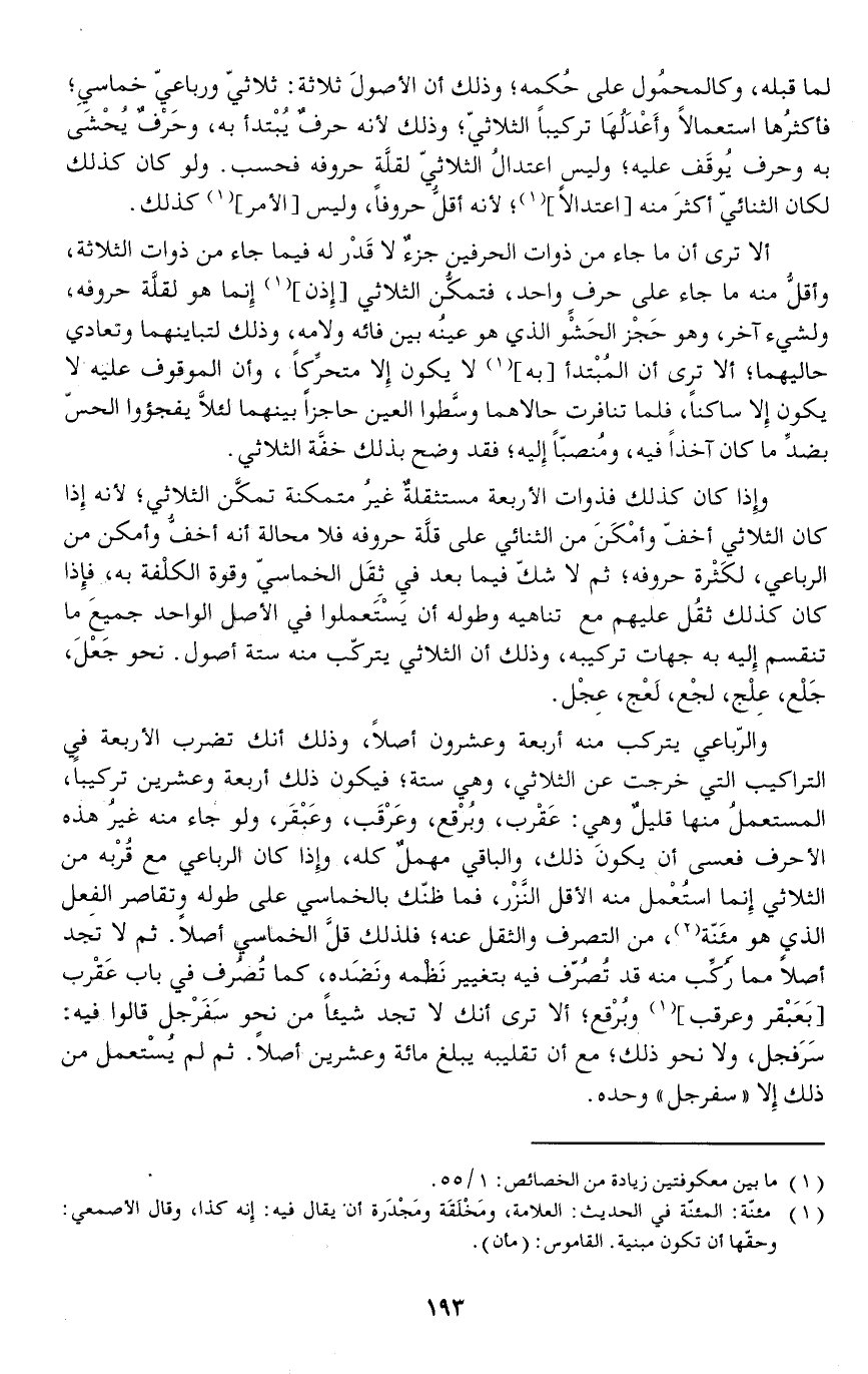 ألا ترى أن ما جاء من ذوات الحرفين جزءٌ لا قَدْر له فيما جاء من ذوات الثلاثة وأقلُّ منه ما جاء على حرفٍ واحد فتمكُّن الثلاثي (إذن) إنما هو لقلَّة حروفه ولشيء آخر وهو حَجْز الحَشْو الذي هو عينُه بين فائه ولامه وذلك لتباينهما وتعادي حاليهما ألا ترى أن المُبْتدأ (به) لا يكون إلا متحرِّكاً وأن الموقوف عليه لا يكون إلا ساكنا فلما تنافرت حالاهما وسَّطوا العين حاجزا بينهما لئلاَّ يفجؤوا الحس بضدِّ ما كان آخذا فيه ومُنصبّاً إليه فقد وضح بذلك خفَّة الثلاثي.