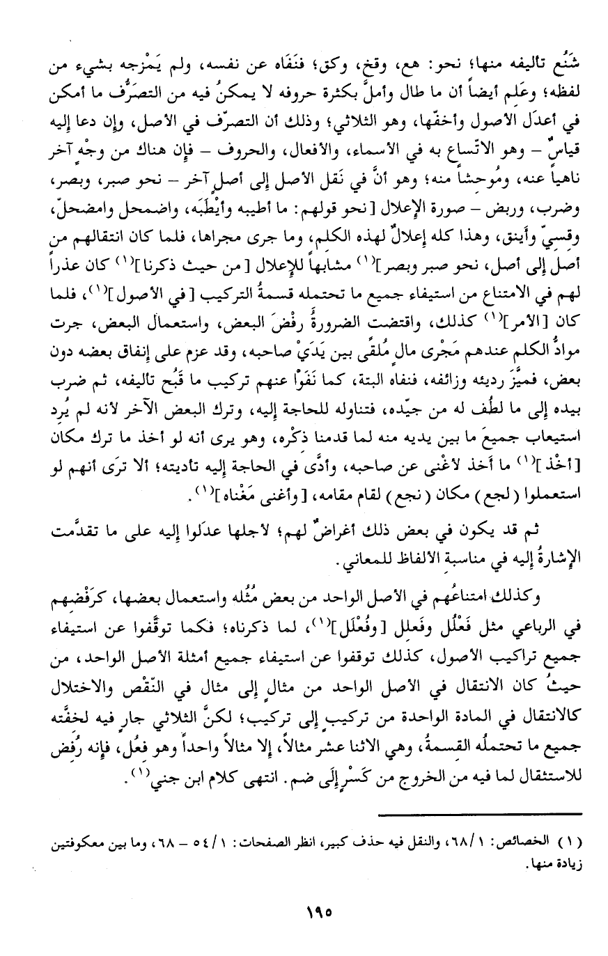 شَنُع تأليفه منها نحو: هع وقخ وكق فنَفَاه عن نفسه ولم يَمْزجه بشيء من لفظه وعَلِم أيضا أن ما طال وأملَّ بكثرة حروفه لا يمكنُ فيه من التصَرُّف ما أمكن في أعدَل الأصول وأخفها وهو الثلاثي وذلك أن التصرف في الأصل وإن دعا إليه قياسٌ - وهو الاتساع به في الأسماء والأفعال والحروف - فإن هناك من وجْهٍ آخر ناهيا عنه ومُوحِشاً منه وهو أنَّ في نَقل الأصل إلى أصلٍ آخر - نحو صبر وبصر وضرب وربض - صورة الإعلال (نحو قولهم: ما أطيبه وأيْطَبَه واضمحل وامضحل وقِسِيّ وأَينق وهذا كله إعلالٌ لهذه الكلِم وما جرى مجراها فلما كان انتقالهم من أصل إلى أصل نحو صبر وبصر) مشابها للإعلال (من حيث ذكرنا) كان عذرا لهم في الامتناع من استيفاء جميع ما تحتمِله قسمةُ التركيب (في الأصول) فلما كان (الأمر) كذلك واقتضت الضرورةُ رفْضَ البعض واستعمال البعض جرت موادُّ الكلم عندهم مَجْرى مالٍ مُلقًى بين يَدَيْ صاحبه وقد عزم على إنفاق بعضه دون بعض فميَّزَ رديئه وزائفه فنفاه البتة كما نَفَوّْا عنهم تركيب ما قَبُح تأليفه ثم ضرب بيده إلى ما لطُف له من جيده فتناوله للحاجة إليه وترك البعض الآخر لأنه لم يُرِد استيعاب جميعَ ما بين يديه منه لما قدمنا ذِكْره وهو يرى أنه لو أخذ ما ترك مكان (أخْذ) ما أَخذ لأغْنى عن صاحبه وأدَّى في الحاجة إليه تأديته ألا ترَى أنهم لو استعملوا (لجع) مكان (نجع) لقام مقامه (وأغنى مَغْناه) .