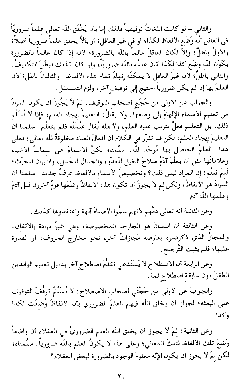 والثاني - لو كانت اللغاتُ توقيفية فذلك إما بأن يَخْلُق الله تعالى عِلماً ضروريا في العاقل أنَّه وَضَع الألفاظ لكذا أو في غير العاقل أو بألاَّ يخلقَ علما ضروريا أصلا والأولُ باطلٌ وإلا لكان العاقلُ عالما بالله بالضرورة لأنه إذا كان عالما بالضرورة بكَوْن اللهِ وضَع كذا لِكَذا كان علمُه بالله ضروريا ولو كان كذلك لبطَلَ التكليفُ.
