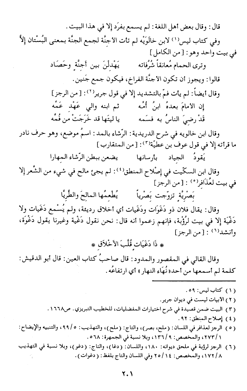 وفي كتاب ليس لابن خالَوَيْه لم تأت الأجِنَّة لجمع الجنَّة بمعنى البُسْتان إلاَّ في بيت واحد وهو: // من الكامل //