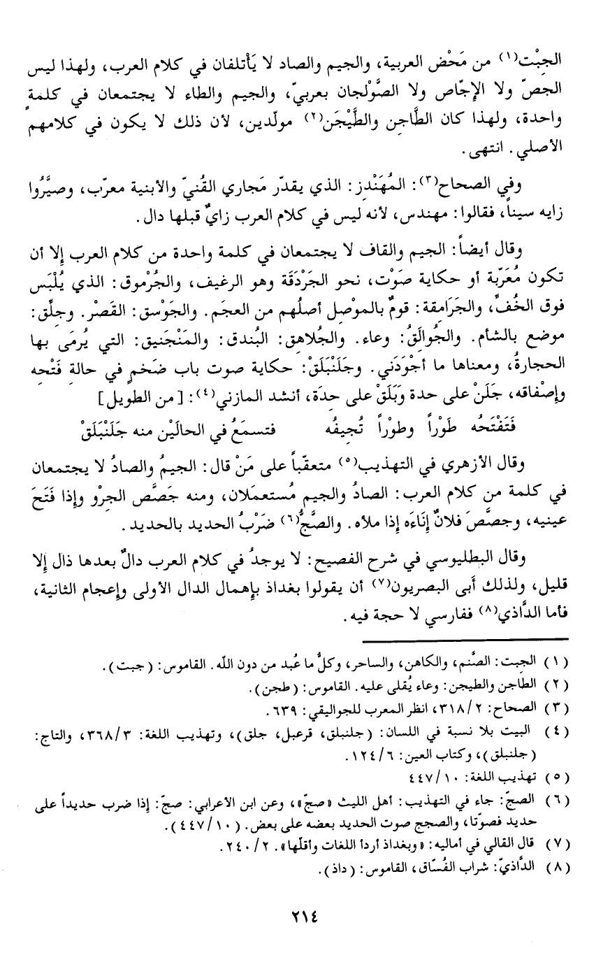 الجِبْت من مَحْض العربية والجيم والصاد لا يَأْتلفان في كلام العرب ولهذا ليس الجص ولا الإجاص ولا الصَّوْلجان بعربي والجيم والطاء لا يجتمعان في كلمةٍ واحدة ولهذا كان الطَّاجِن والطَّيْجَن مولدين لأن ذلك لا يكون في كلامهم الأصلي.