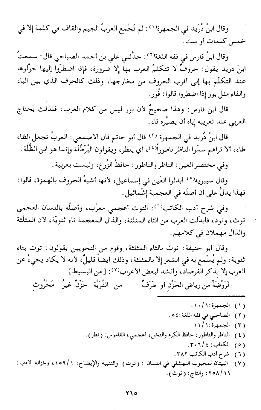 وقال ابنُ فارس في فقه اللغة: حدَّثني علي بن أحمد الصباحي قال: سمعتُ ابنَ دريد يقول: حروفٌ لا تتكلمُ العرب بها إلا ضرورة فإذا اضطروا إليها حوَّلوها عند التكلم بها إلى أقرب الحروف من مخارجها وذلك كالحرف الذي بين الباء والفاء مثل بور إذا اضطروا قالوا: فُور.