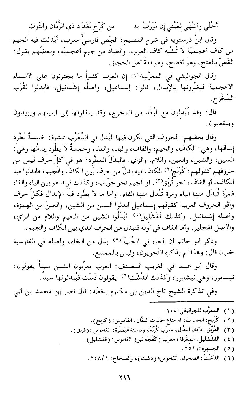 أو الجيم نحو جَوْرب وكذلك فِرِند هو بين الباء والفاء فمرة تُبْدَل منها الباء ومرة تُبْدل منها الفاء وأما لا يطرد فيه الإبدال فكلُّ حرف وافَق الحروف العربية كقولهم إسماعيل أبدلوا السين من الشين والعينَ من الهمزة وأصله إشمائيل.