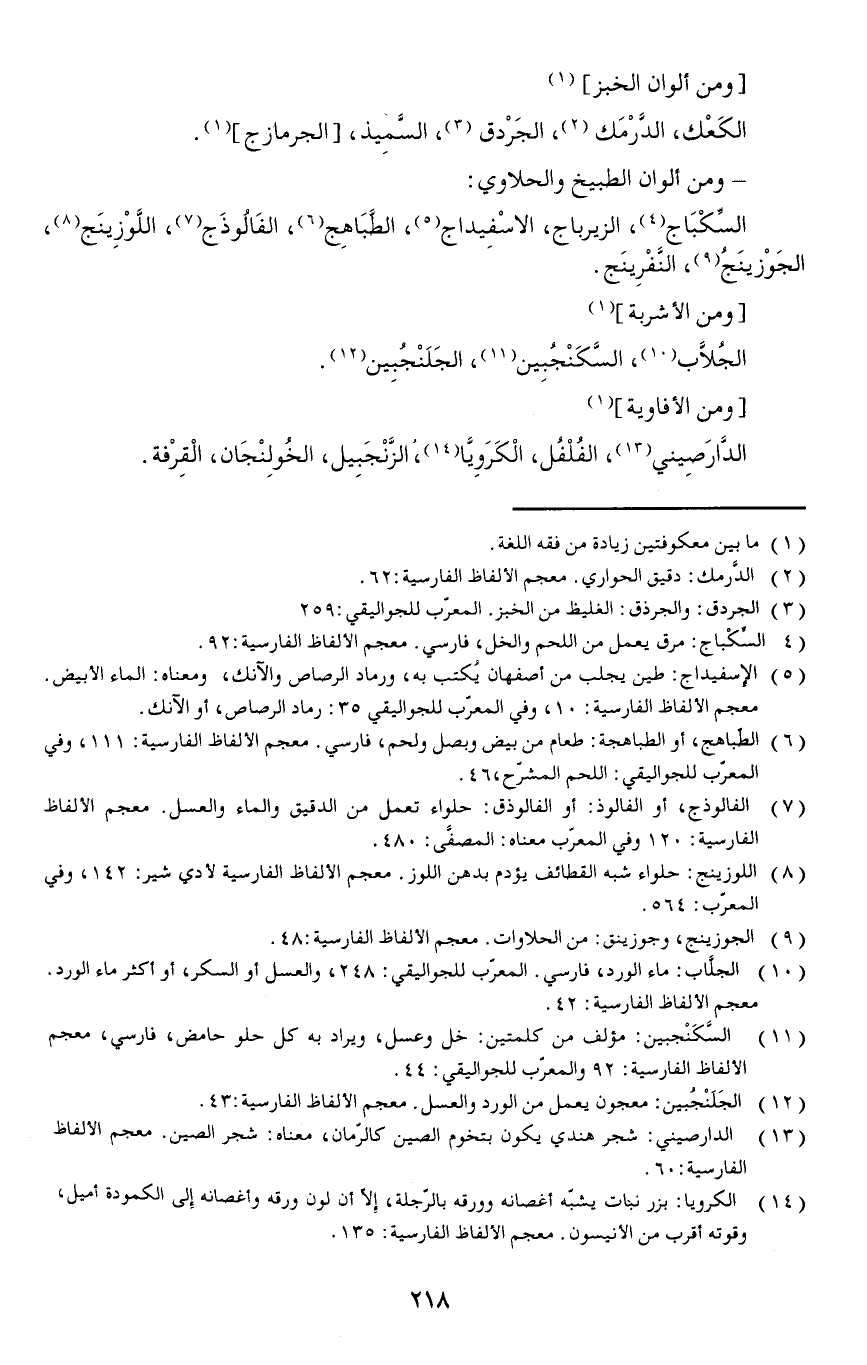 السِّكْبَاج الزيرباج الاسْفِيداج الطَّبَاهِج الفَالُوذَج اللَّوْزِينَج الجَوْزينَجُ النفرينج.