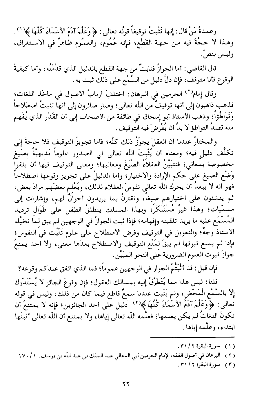 قلنا: ليس هذا مما يُتَطَرَّقُ إليه بمسالك العقول فإن وقوعَ الجائز لا يُسْتَدْرك إلا بالسَّمْعِ الْمَحْضِ ولم يَثْبت عندنا سمعٌ قاطع فيما كان من ذلك وليس في قوله تعالى {وَعَلَّمَ آدَمَ الأَسْمَاءَ كُلَّهَا} دليل على أحد الجائزين فإنه لا يمتنعُ أن تكونَ اللغاتُ لم يكن يعلمها فعلَّمه الله تعالى إياها ولا يمتنع أن الله تعالى أثبتَها ابتداء وعلَّمه إياها.