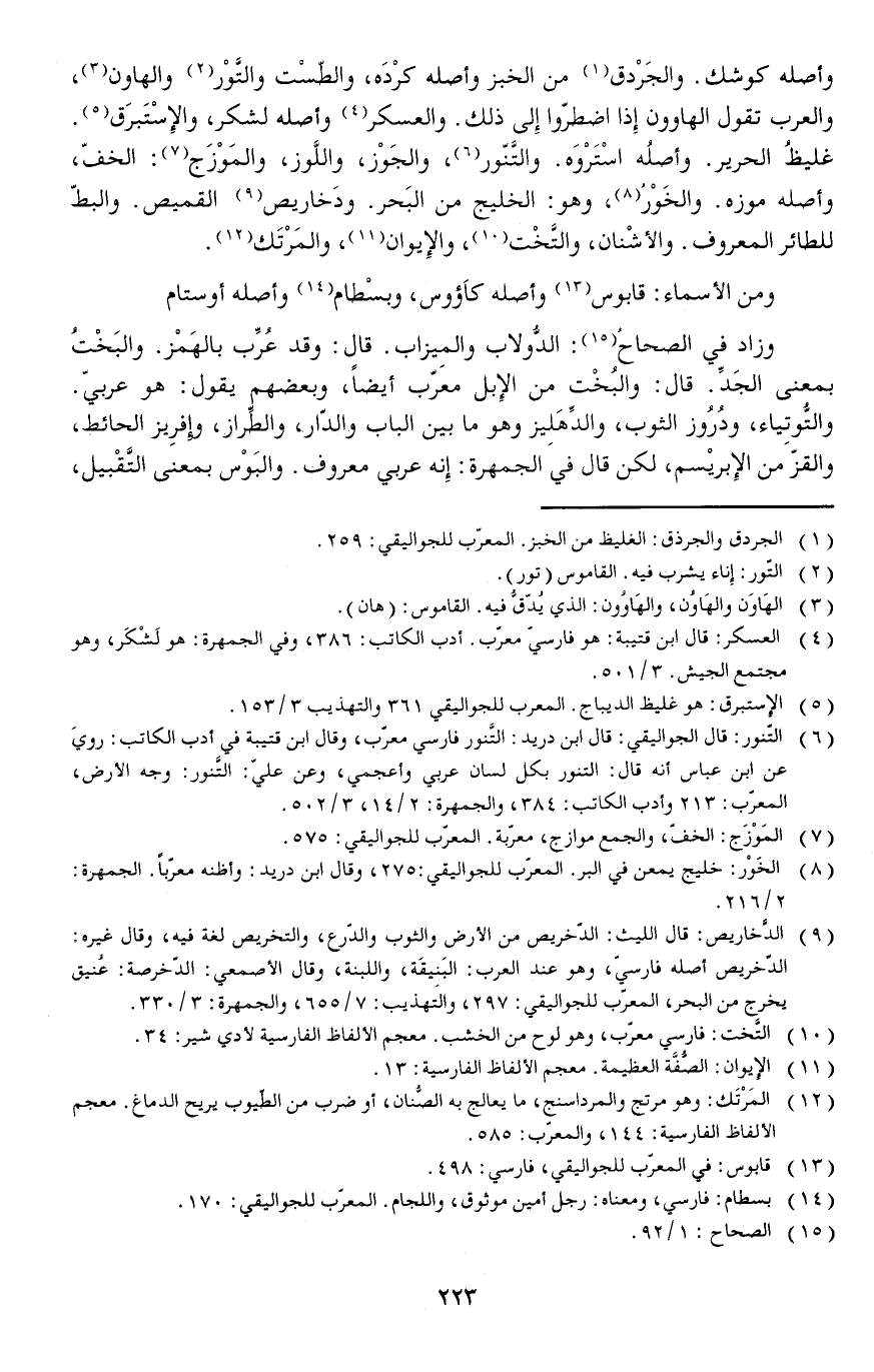 والجَرْدق من الخبز وأصله كرْدَه والطّسْت والتَّوْر والهاون والعرب تقول الهاوون إذا اضطروا إلى ذلك.