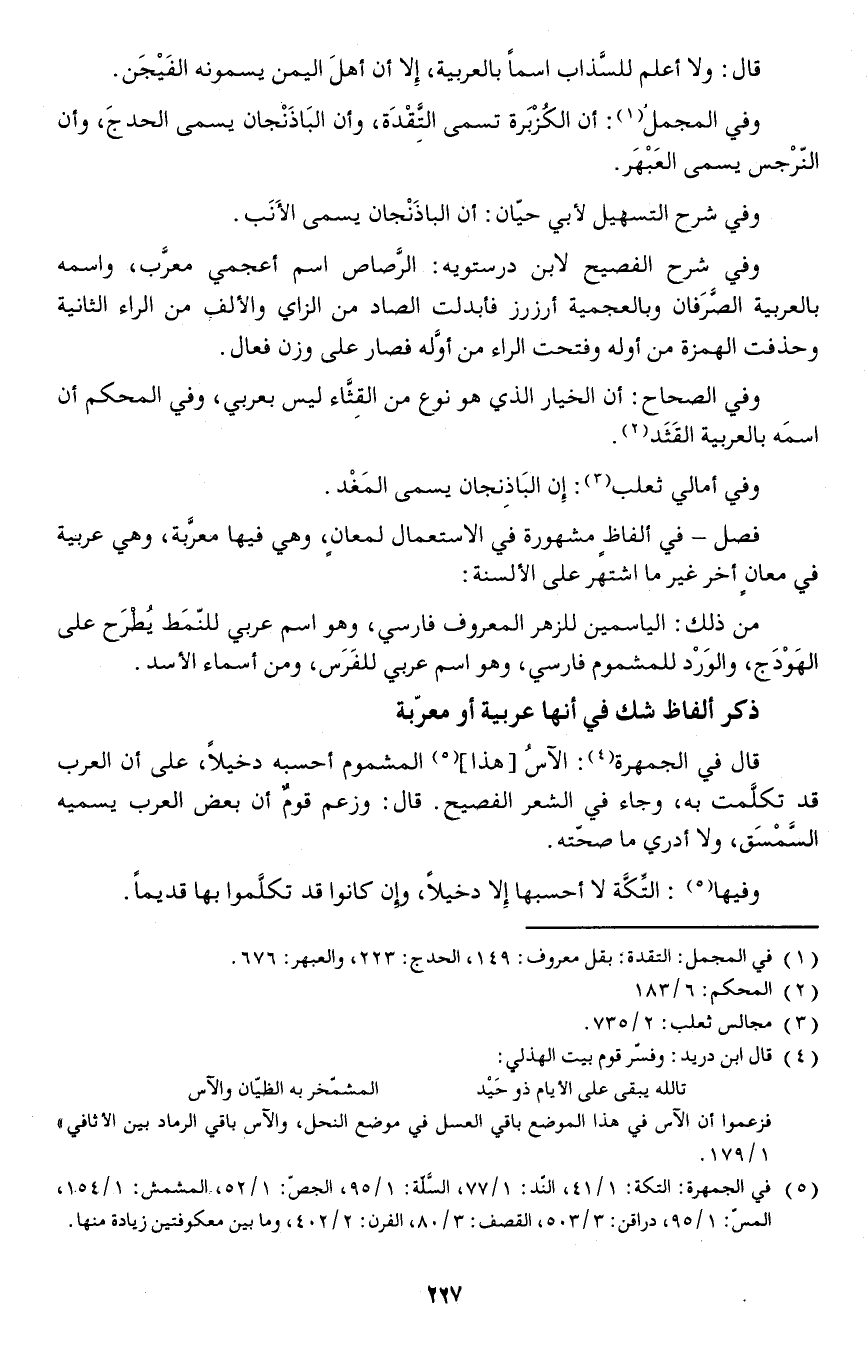 من ذلك: الياسمين للزهر المعروف فارسي وهو اسم عربي للنمط يطرح على الهودج والورد للمشموم فارسيه واسم عربي للفرس ومن أسماء الأسد.