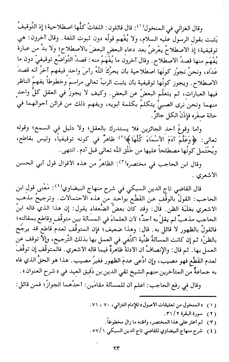 وأما وقوعُ أحدِ الجائزين فلا يستدرك بالعقل ولا دليل في السمع وقوله تعالى: {وَعَلَّمَ آدَمَ الأَسْمَاءَ كُلَّهَا} ظاهرٌ في كونه توقيفيا وليس بقاطع ويُحْتَمل كونُها مصطلحا عليها من خَلْق الله تعالى قبل آدم.