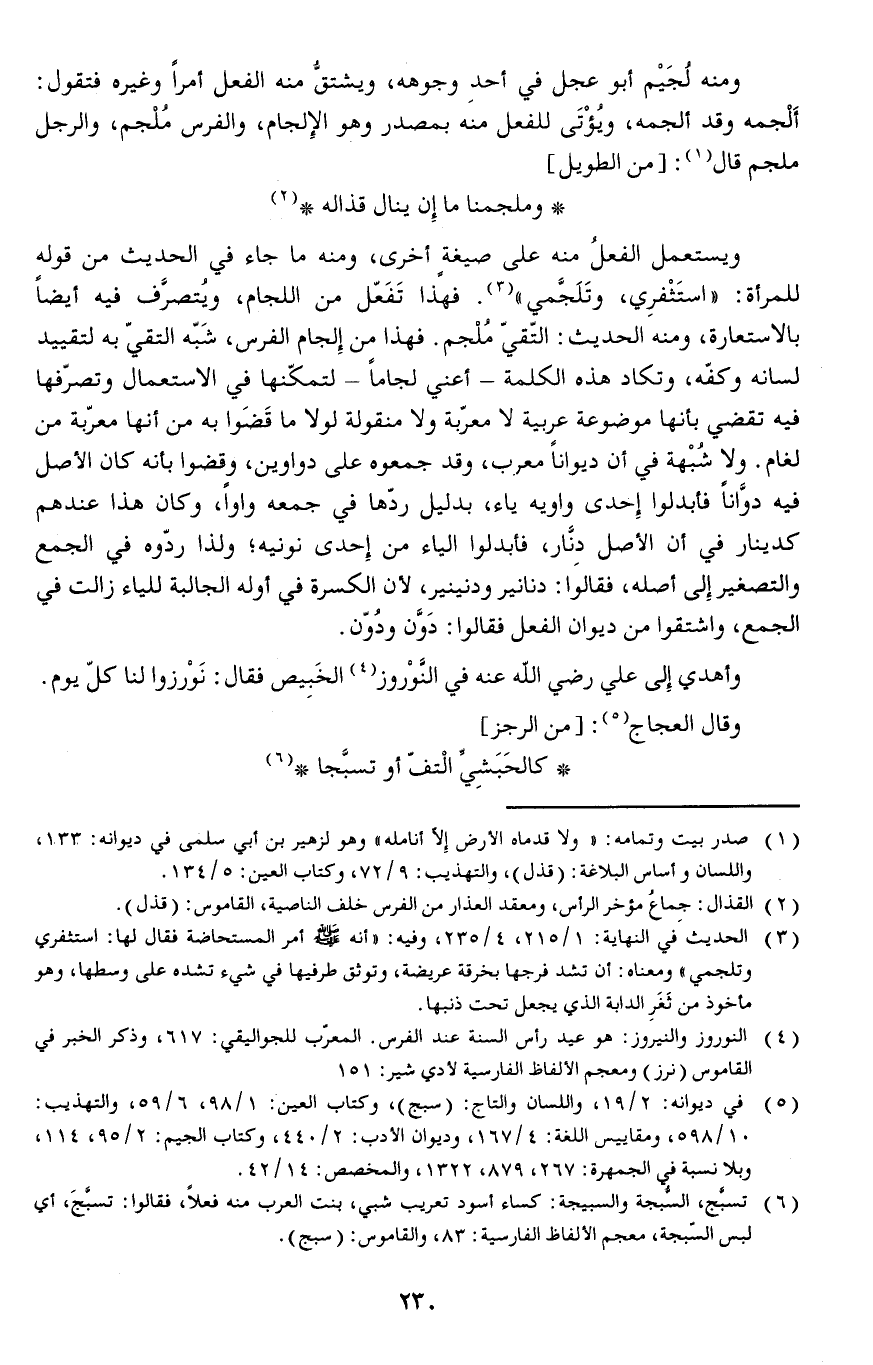 فهذا من إلجام الفرس شَبّه التقي به لتقييد لسانه وكفه وتكاد هذه الكلمة - أعنى لجاما - لتمكنها في الاستعمال وتصرفها فيه تقضي بأنها موضوعة عربية لا معربة ولا منقولة لولا ما قَضَوا به من أنها معربة من لغام.
