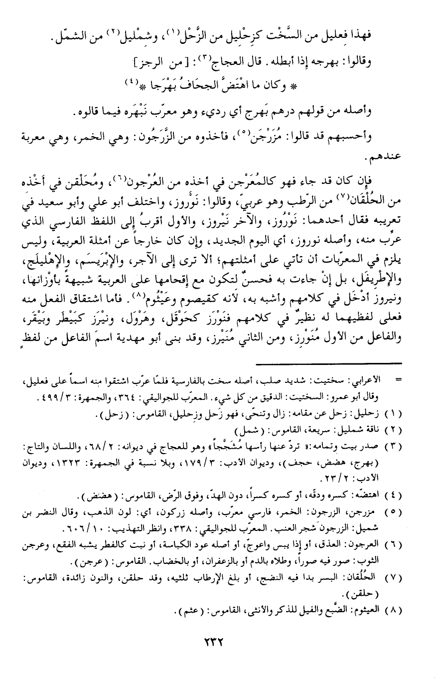 فإن كان قد جاء فهو كالمُعَرْجن في أخذِه من العُرْجون ومُحَلْقن في أَخْذِه من الحُلْقَان من الرطب وهو عربي وقالوا: نَوْروز واختلف أبو علي وأبو سعيد في تعريبه فقال أحدهما: نَوْرُوز والآخر نَيْروز والأول أقربُ إلى اللفظ الفارسي الذي عرِّب منه وأصله نوروز أي اليوم الجديد وإن كان خارجا عن أمثله العربية وليس يلزم في المعربات أن تأتي على أمثلتهمألا ترى إلى الآجر والإبْرَيسَم والإهْليلَج والإطْرِيفَل بل إنْ جاءت به فحسنٌ لِتكون مع إقحامها على العربية شبيهة بأوْزانها ونيروز أدْخَل في كلامهم وأشبه به لأنه كقيصوم وعَيْثُوم.