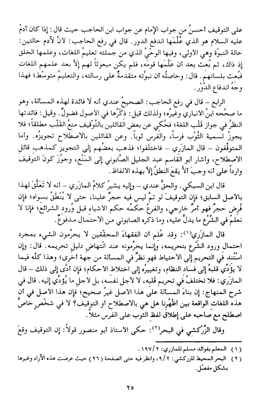 وأما المتوقِّفون - قال المازَرِي - فاختلَفوا فذهب بعضُهم إلى التجويز كمذهبِ قائلِ الاصطلاح وأشار أبو القاسم عبد الجليل الصَّابوني إلى المَنْع وجوَّزَ كونَ التوقيف واردا على أنه وجبَ ألاَّ يقعَ النطقُ إلا بهذه الألفاظ.