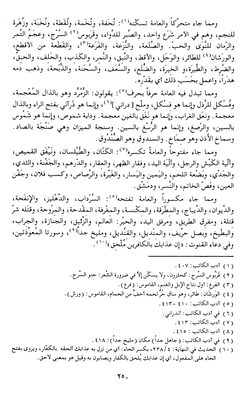 ومما جاء مفتوحا والعامةُ تكسره: الكَتّان والطَّيْلسان ونَيْفَق القميص وأَلْية الكَبْش والرجل وأَلْيَة اليد وفقار الظهر والعِقار والدرهم والجَفْنة والثدي والجَدْي وبَضْعة اللحم واليَمين واليَسار والغَيْرة والرَّصاص وكسب فلان وجَفْن العين وفَصّ الخاتم والنَّسر ودمَشْق.