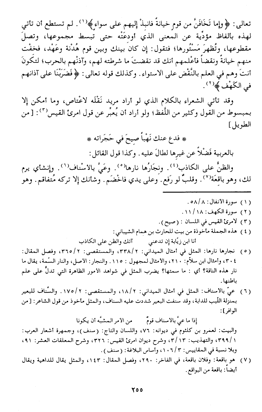 لم تستطع أن تأتي لهذه بألفاظ مؤدِّية عن المعنى الذي أودِعَتْه حتى تبسط مجموعها وتصل مقطوعها وتظهر مستورهافتقول: إن كان بينك وبين قوم هُدْنة وعَهْد فخِفْت منهم خيانة ونقضا فأعْلمهم أنك قد نقضت ما شرطته لهم وآذنهم بالحربلتكون أنتَ وهم في العلم بالنَّقْض على الاستواء.
