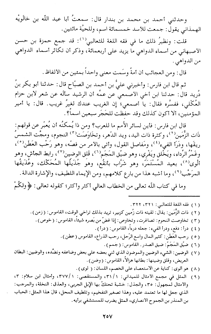 وحدثني أحمد بن محمد بن بندار قال: سمعتُ أبا عبد الله بن خالَويْه الهمذاني يقول: جمعت للأسد خمسمائة اسم وللحيَّة مائتين.