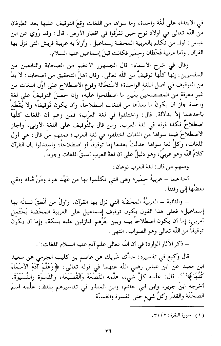 قال: واختلفوا في لغة العرَب فمَن زعم أن اللغاتِ كلَّها اصطلاحٌ فكذا قوله في لغة العرب ومن قال بالتَّوقيف على اللغةِ الأولى وأجاز الاصطلاحَ فيما سواها من اللغات اختلفوا في لغة العرب فمنهم من قال: هي أول اللغات وكلُّ لغةٍ سواها حدثَتْ بعدها إما توقيفا أو اصطلاحا واستدلوا بأن القرآن كلامُ الله وهو عربي وهو دليلٌ على أن لغةَ العربِ أسبقُ اللغات وجودا.