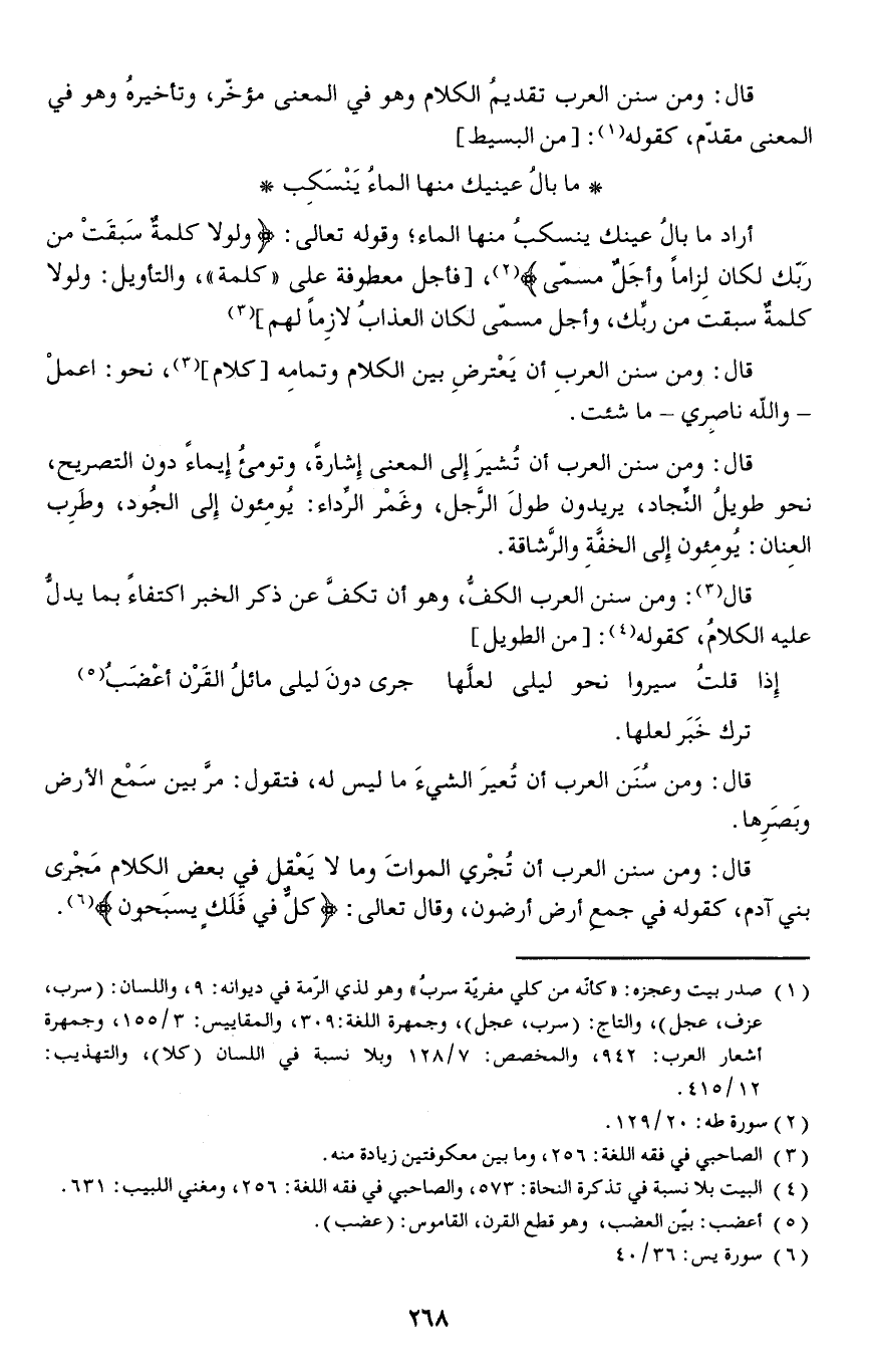 قال: ومن سنن العرب تقديمُ الكلام وهو في المعنى مؤخر وتأخيرهُ وهو في المعنى مقدم كقوله: // من البسيط //