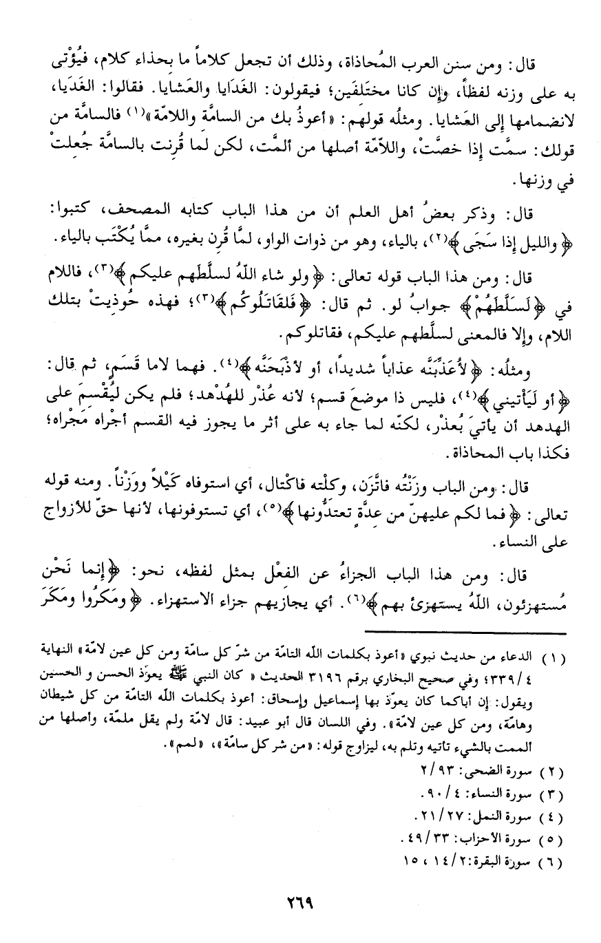 ومثلُه قولهم: (أعوذُ بك من السامَّةِ واللامة) فالسامة من قولك: سمت إذا خصَّتْ واللامة أصلها من ألمَّت لكن لما قُرِنت بالسامَّة جُعِلتْ في وزنها.