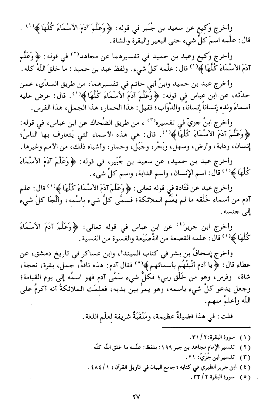 وأخرج عبد بن حميد عن سعيد بن جُبَير في قوله: {وَعَلَّمَ آدَمَ الأَسْمَاءَ كُلَّهَا} قال: اسم الإنسان واسم الدابة واسم كلِّ شيء.