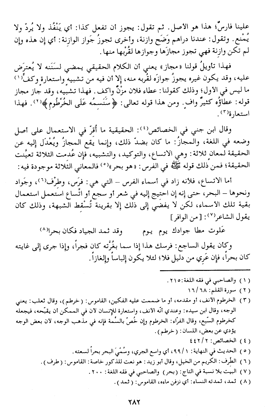 وقال ابن جني في الخصائص: الحقيقية ما أُقِرّ في الاستعمال على أصل وضعه في اللغة والمجازُ: ما كان بضد ذلك وإنما يقع المجازُ ويُعْدَل إليه عن الحقيقة لمعانٍ ثلاثة: وهي الاتساع والتوكيد والتشبيه فإن عُدِمت الثلاثة تعيَّنت الحقيقة فمن ذلك قوله صلى الله عليه وسلم في الفرس: (هو بحر) فالمعاني الثلاثة موجودة فيه: