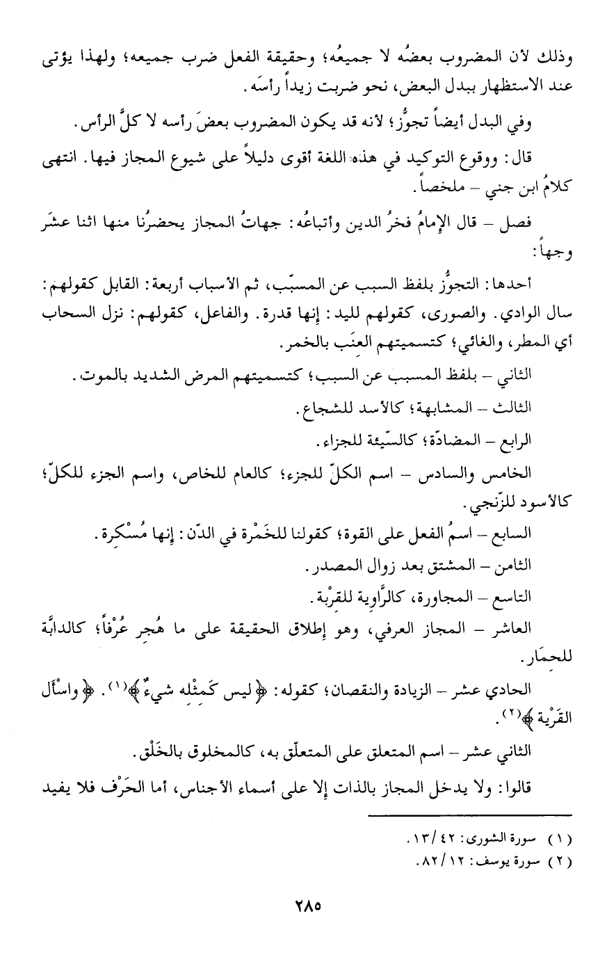 فصل - قال الإمامُ فخرُ الدين وأتباعُه: جهاتُ المجاز يحضرُنا منها اثنا عشَر وجها: