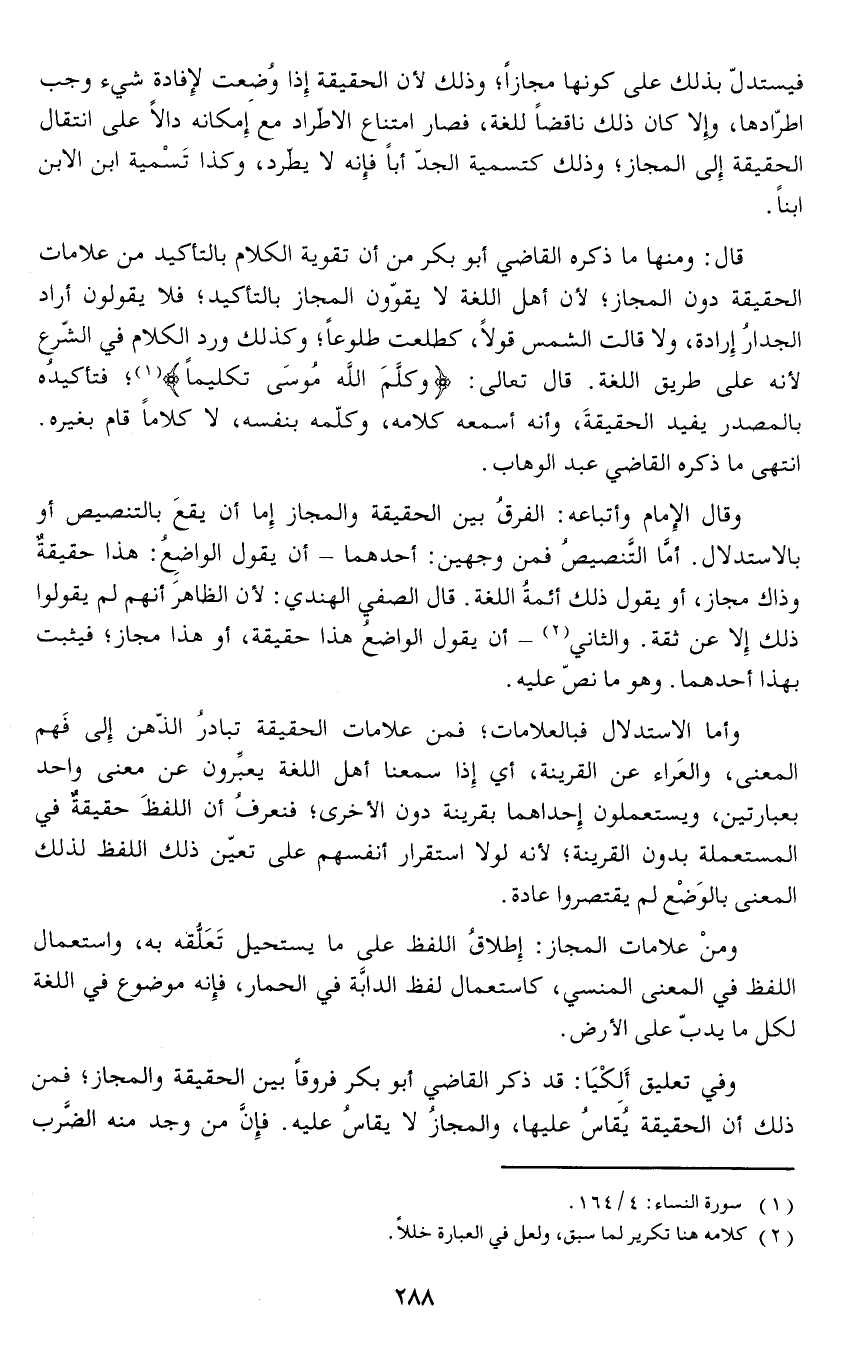 أمَّا التَّنصيصُ فمن وجهين: أحدهما - أن يقول الواضِعُ: هذا حقيقةٌ وذاك مجاز أو يقول ذلك أئمةُ اللغة.