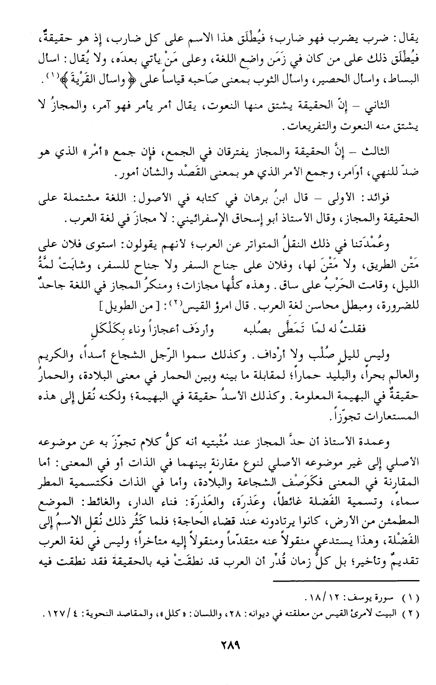 وعمدة الأستاذ أن حدَّ المجاز عند مُثْبتيه أنه كلُّ كلام تجوّزَ به عن موضوعه الأصلي إلى غير موضوعه الأصلي لنوع مقارنةٍ بينهما في الذات أو في المعنى: أما المقارنة في المعنى فكَوَصْف الشجاعة والبلادة وأما في الذات فكتسمية المطر سماءوتسمية الفضلة غائطاوعذرة والعَذِرَة: فناء الدار والغائط: الموضع المطمئن من الأرض كانوا يرتادونه عند قضاء الحاجة فلما كَثُر ذلك نُقِل الاسمُ إلى الفَضْلة وهذا يستدعي منقولا عنه متقدما إليه متأخراوليس في لغة العرب تقديم وتأخيربل كلُّ زمان قُدِّر أن العرب قد نطقَتْ فيه بالحقيقة فقد نطقت فيه