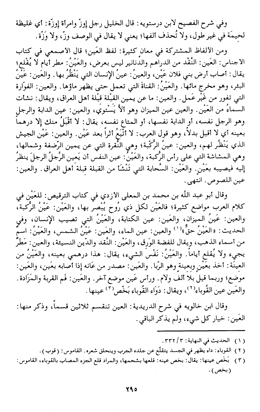 وقال ابن خالويه في شرح الدريدية: العين تنقسم ثلاثين قسماوذكر منها: العين: خيار كل شيءولم يذكر الباقي.